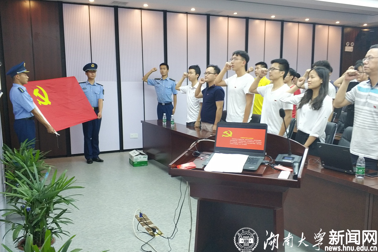 仪式在庄严的《国际歌》中拉开帷幕,洪波宣读预备党员宣誓名单。在庄严的党旗下,博彩平台领导和老师将党徽佩戴在新党员同志胸前。在国防生党员闫冰带领下,26名预备党员右手握拳举过肩头,面向鲜红的党旗,逐句庄严宣誓。