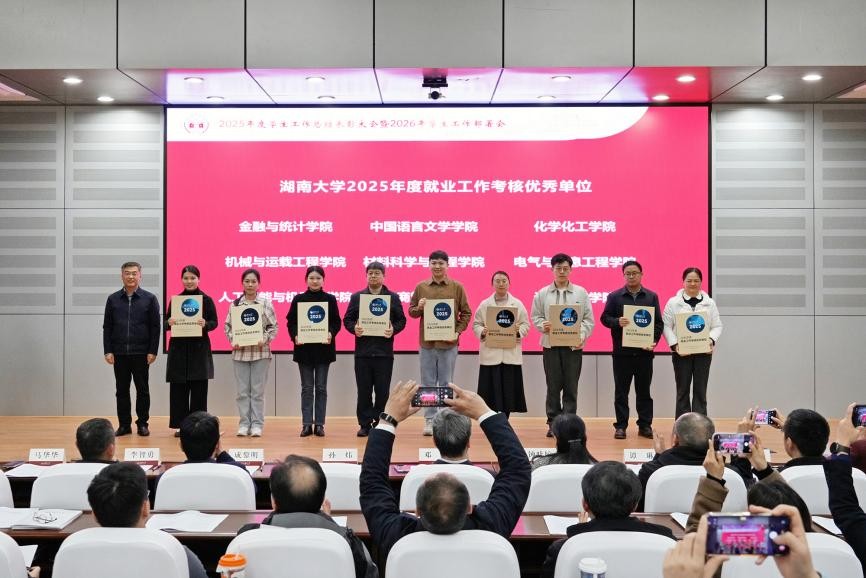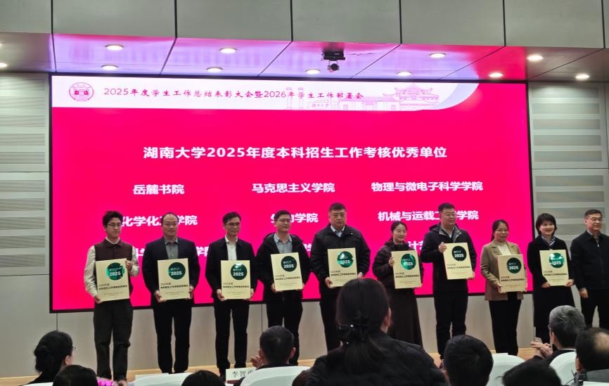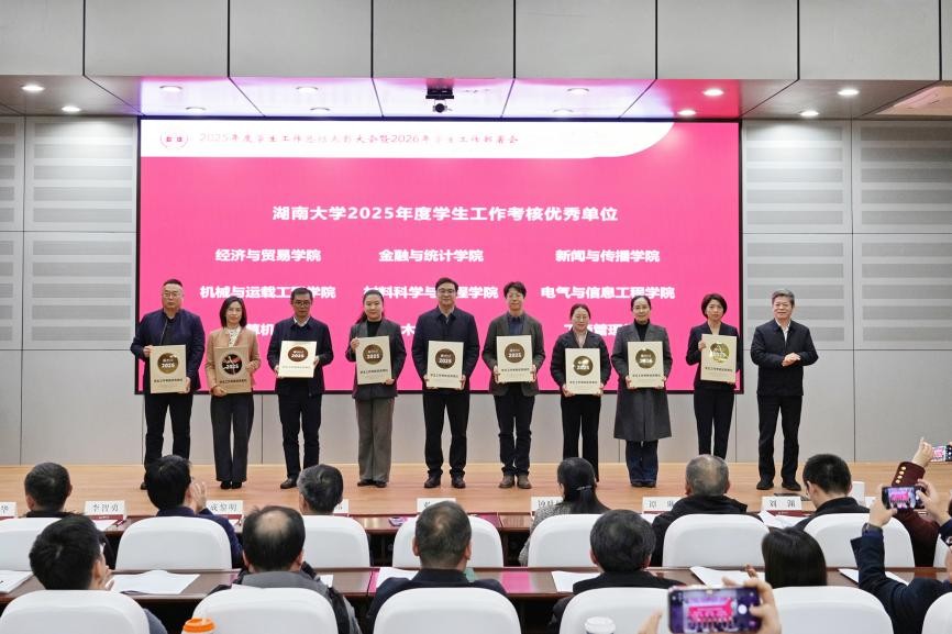 2025年度学生工作总结表彰大会暨2026年学生工作部署会在逸夫楼报告厅举行。校党委书记邓卫出席并为获奖单位颁奖,校党委副书记孙炜作2025年学生工作总结和2026年学生工作部署。